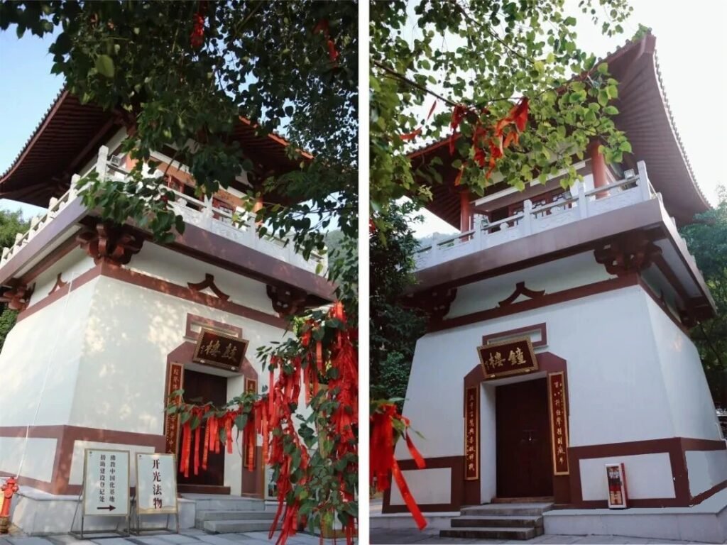 进山门之后,有钟、鼓二楼相对。左(东)为钟楼,右(西)为鼓楼。一般早晨先敲钟,以鼓相应;傍晚则先击鼓,以钟相应。
