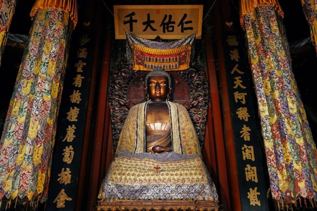 大雄宝殿中供奉本师释迦牟尼佛的佛像。“大雄”是佛的德号。“大”者,是包含万有的意思;“雄”者,是摄伏群魔的意思。因为释迦牟尼佛具足圆觉智慧,能雄镇大千世界,因此佛弟子尊称他为“大雄”。宝殿的“宝”,是指佛法僧三宝。