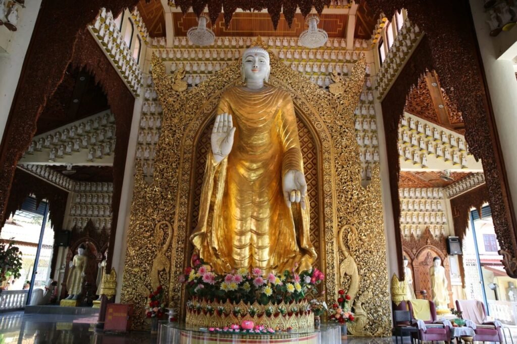 第二种:立佛。左手下垂,右手屈臂向上伸,这名为“栴(zhān)檀(tán)佛像”。